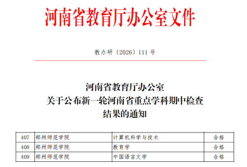 近日,河南省教育厅办公室公布了新一轮河南省重点学科期中检查结果,我校计算机科学与技术、教育学、中国语言文学三个省级重点学科凭借扎实的建设基础、突出的建设成效,全部顺利通过期中检查。